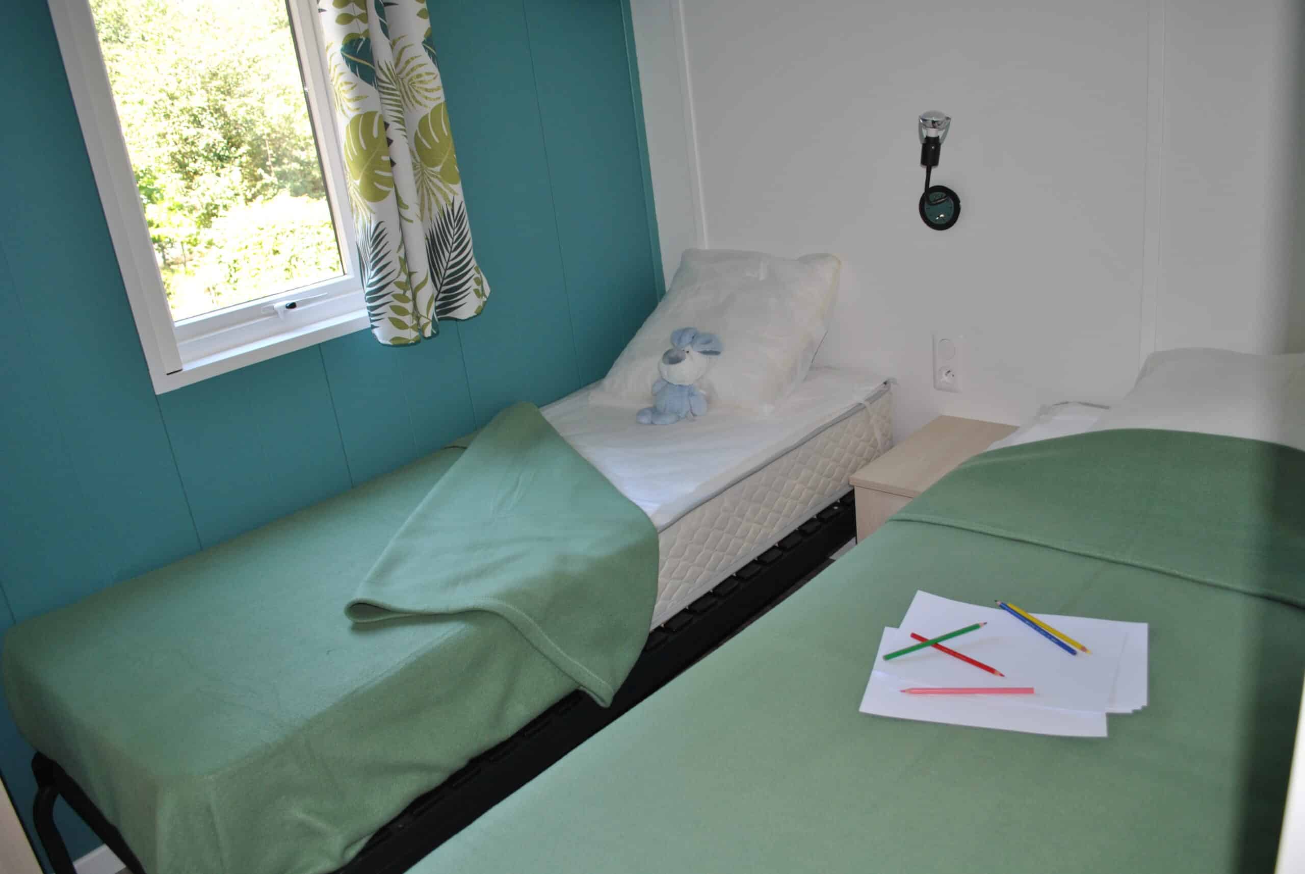 1 slaapkamer met 2 eenpersoonsbedden 80 x 190cm (en een hoogslaper bij de 5 persoons chalet).